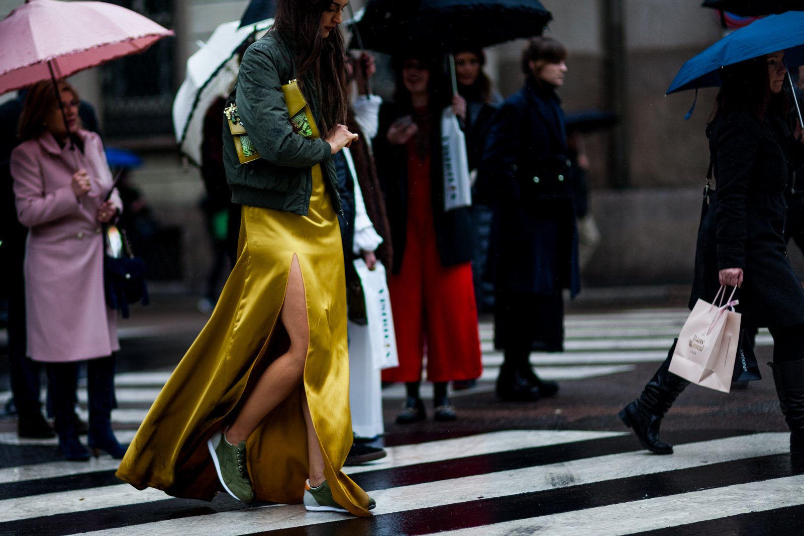 Ebben az összeállításban a selyem maxiruha és a bomberdzseki , sneaker párosítása mellett a ruha oldal hasítéka is zseniális. Egyszerű, kényelmes, de ugyanakkor szexi.